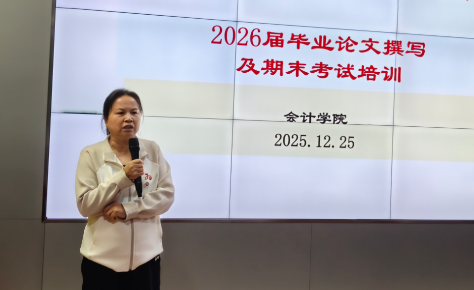 为进一步规范毕业论文指导流程,提升本科毕业论文质量,2025年12月25日下午,会计学院组织全体毕业论文指导教师在学院报告厅开展论文撰写专题培训。全体论文指导指导教师参加了培训,本次培训由主管教学副院长杨旻教授主讲,为全体指导教师送上了一份兼具专业性与实用性的“学术指南”。