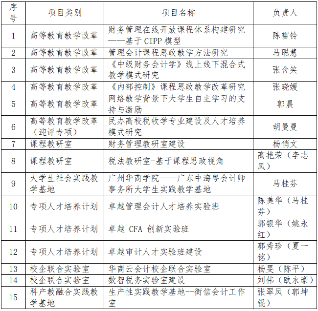 经学术委员会认真评审、合议,遴选出6个类别15项课题申报广州华商学院2022年校质量工程建设项目。其中,高等教育教学改革项目(含迎评专项研究项目1项)6项、课程教研室2项、大学生社会实践教学基地1项、专项人才培养计划3项、校企联合实验室2项、科产教融合实践教学基地1项。