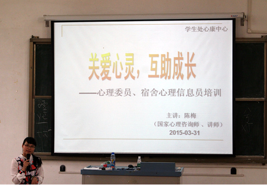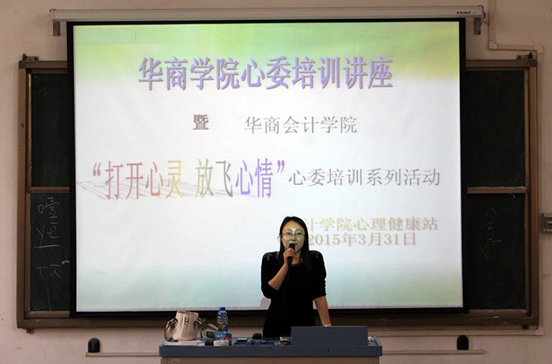 为了提高会计学院全体心理委员和心理健康站成员的心理素质和工作能力,2015年3月31日,“关爱心灵,互助成长”讲座在励志楼D208室开讲。国家心理咨询师陈梅老师给会计学院大一至大三全体心委和会计学院心理健康站全体成员进行培训。