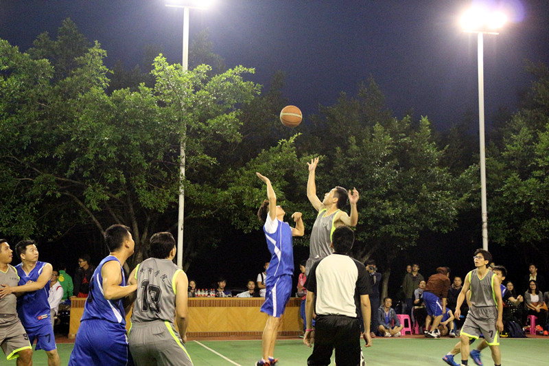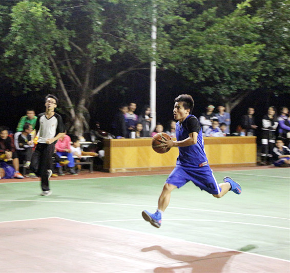 11月10日下午18:00华商学院教职工篮球总决赛如火如荼地举行。身着蓝色球服的会计学院和身着灰色球服的(文学、信工、工商)三系连队教职工互相争锋,尽情展示着生命迸发的激情与活力。球员一一登场,一场令在场观众翘首以盼的比赛正式开始。