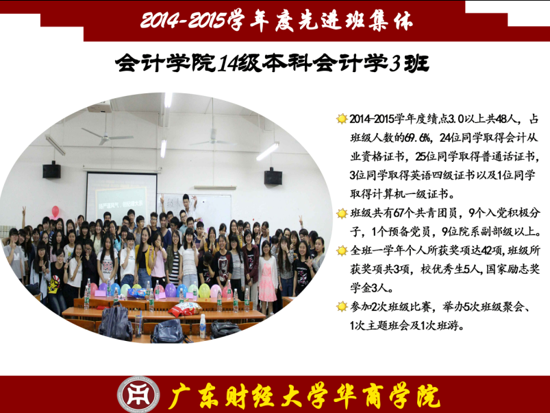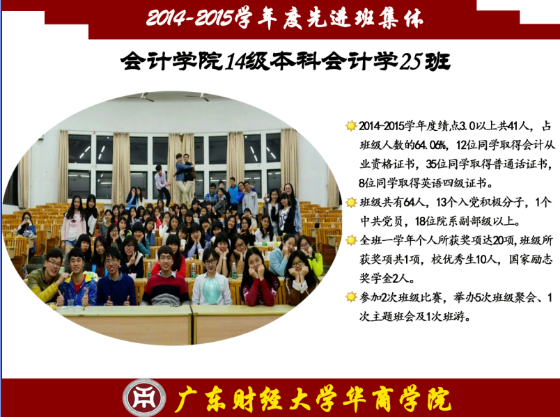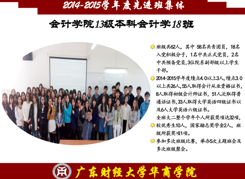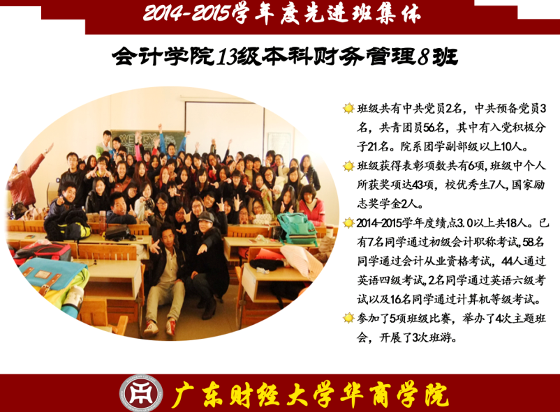 先进班集体是由一个有着不同个性的个体组成的,他们的展现方式各不相同,但他们有一个共同的特点——志存高远,他们是勇攀高峰的践行者,怀揣着征服科学高峰的梦想;他们是奋力扬帆的舵手,要在知识的海洋中自在遨游;他们是骏马,要在知识的草原上驰骋;他们是雄鹰,要在知识的天空中翱翔;他们是勇士,要在知识的历史中留下永不磨灭的印记。