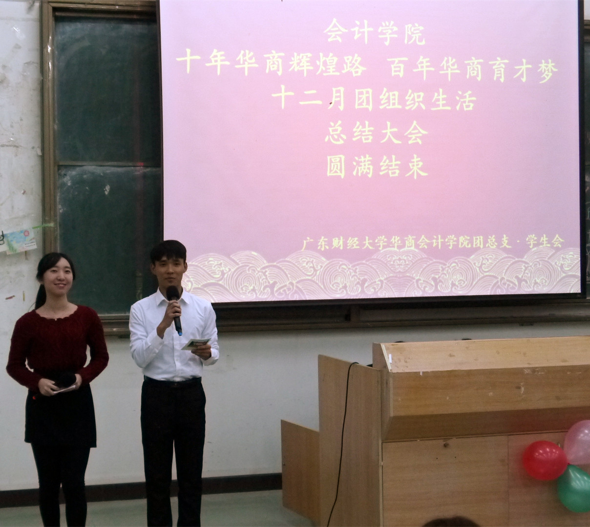 12月16日19:30,以“十年华商辉煌路,百年华商育才梦”为主题的会计学院十二月团组织生活总结大会在励志楼B207隆重举行。院团委常委吴泽佳、15级年级副主任童蓉、学生会指导老师苏博云、赵静、刘泽、关佩等老师莅临本次大会。