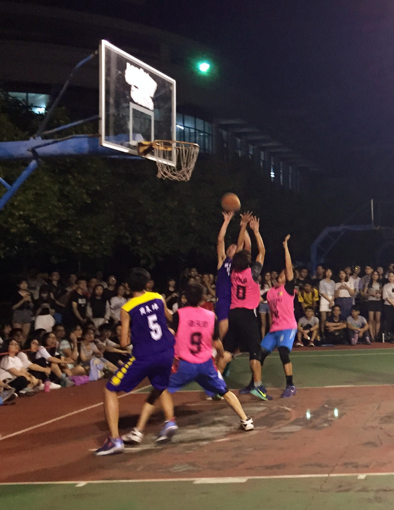 短暂休息过后,第三局比拼开始。紫队队员在上两节比分稍有落后的情况下不甘示弱,在队员们互相配合下加快进攻,欲将比分差距缩小。紫队积极奋进,粉队奋力迎战,不急不躁地将比分保持与拉大。比赛紧张激烈,现场拉拉队与观众不断为赛场上的队员们呐喊加油,紫队、粉队双方的拼搏追逐将比赛推向了高潮。
