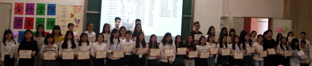 6月14日下午6:00,会计学院学生心理健康站在励志楼D408举行总结大会。院心康总站站长黄锴、工商管理系心康站长袁耀强、文学系心康站长黄沛青、公共管理系心康站长王雪芬、陈梓钊、会计学院心康站长郭永龙,各部门部长,干事以及各班心理委员参加了此次活动。