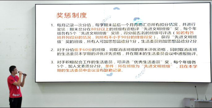 随后,团总支学生会生活部胡家悦部长作了文明安全纪律教育月的工作安排,并对监督机制和奖惩制度进行讲解。大会在热烈的掌声中落下了帷幕,希望同学们携起手来,积极参与文明安全纪律月活动,提高文明素质,共创文明校园。