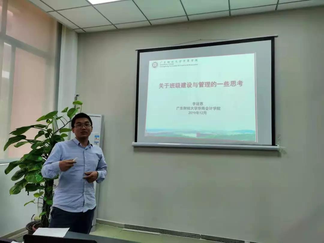 李冠恩老师以“关于班级建设与管理的思考”为主题,对自己管辖的班级工作做了分享汇报。他分别以“班级建设的中心工作”、“班级管理的几点做法”为要点,充分体现了辅导员与学生之间亦师亦友的师生情谊和扮演人生导师、引路人的重要角色。