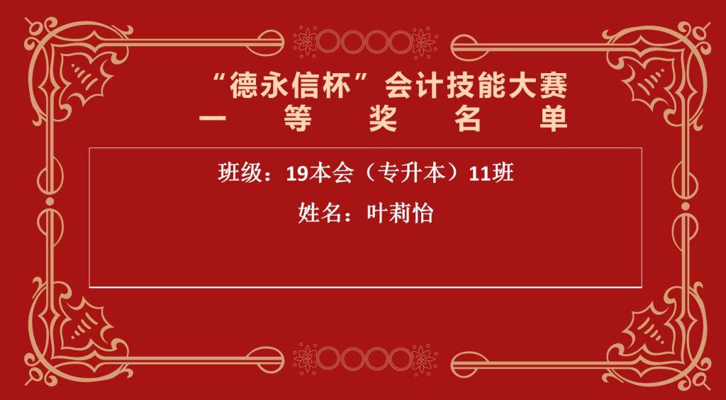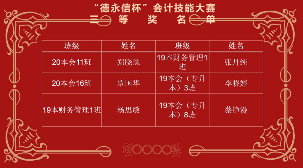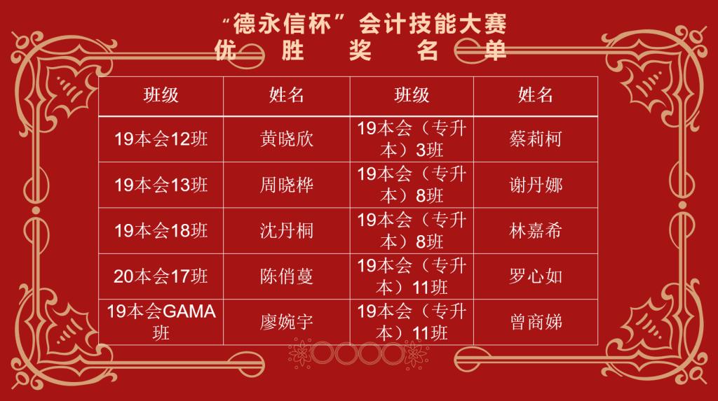 本届“德永信杯”会计技能大赛共评选出一、二、三等奖及优胜奖共20位获奖同学。德永信集团及会计学院领导班子成员分别为获奖者颁发了荣誉证书和奖品。