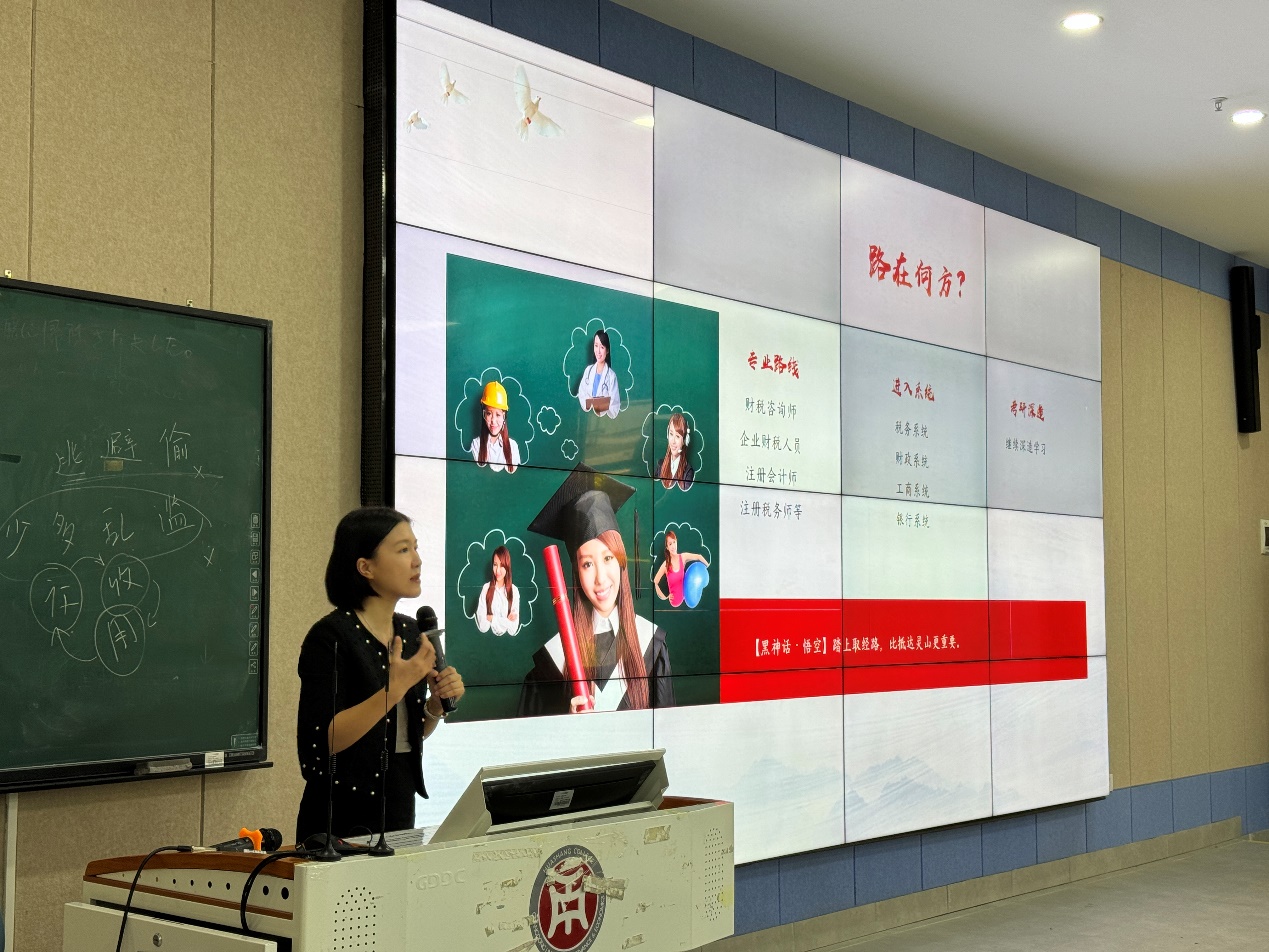 2024年9月12日,我院24级税收学专业的新生齐聚一堂,参加了一场精彩纷呈的专业介绍讲座。活动包括两项内容,税务系副主任雷雨老师为同学们做新生专业导论课,以及财税专家杨柳青女士做主题为“税收专业的未来发展与职业规划”的讲座。讲座由雷雨老师主持。