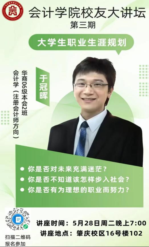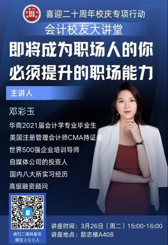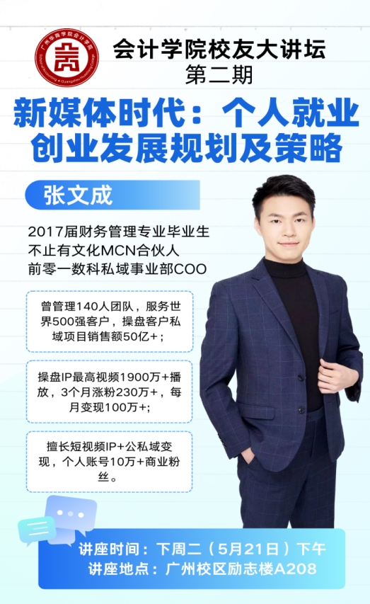 兴业树人二十载,凝心聚力建新功。2025年12月26日广州华商学院将迎来二十周年华诞。从举火拓荒到枝繁叶茂,奋楫笃行;从艰难起步到桃李芳芳,赓续传承。从2005年建校以来,广州华商学院秉承“创百年名校,育华夏英才”的办学理念,秉承“厚德、励志、博学、创新”校训精神,为国家培养了数万名优秀毕业生。我们的校友,奋斗在更高学府;我们的校友,成长于全国各地;我们的校友,遍布于社会各界。会计学院充分认识到校友的重要作用,将深度挖掘校友的智力资源,特在2024年3月至2025年12月开展喜迎二十周年校庆专项行动之“会计校友大讲坛”活动,为母校的人才培养贡献一份力量。昔我同门友,高举振六翮。优秀的学长学姐是我们学习的榜样,更是我们步入社会、奋发进取的指路人。广州华商学院会计学院的莘莘学子期待您的归来。望您能荣归母校,将精彩的人生回顾、将励志的故事传播。特发出诚挚邀请,在此翘首以盼!