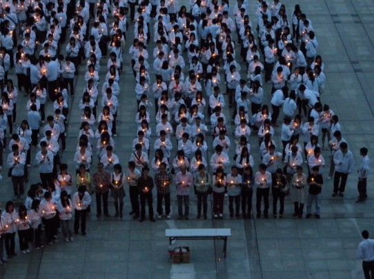 用白色蜡烛临时搭建的中国偌大的版图,用心型的蜡烛围成受难的玉树。会计系师生每个人都捧着点亮蜡烛,紧紧围绕在中国的版图周围,现场沉浸在凝重悲恸的气氛中。