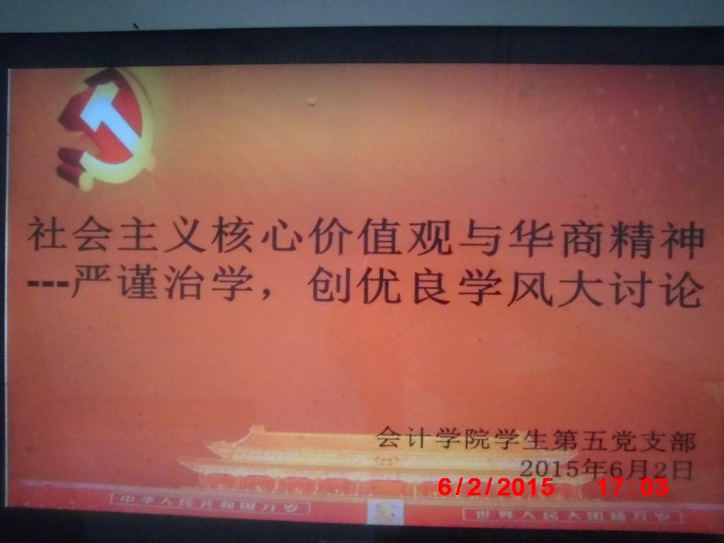 “校风、教风、学风”建设是学校改革和发展中的永恒话题。为弘扬我们学院优良学风,加强教风建设同时改正不足之处,归总我校师生在人才培养、科学研究、社会服务过程中形成的独特的理想信念和价值追求,为学院文化建设建言献策,会计学院学生第五党支部于2015年6月2日在厚德楼C406召开了以“严谨治学,创优良学风”为主题的讨论会。出席本次会议的人员有会计学院学生第五党支部全体学生党员。