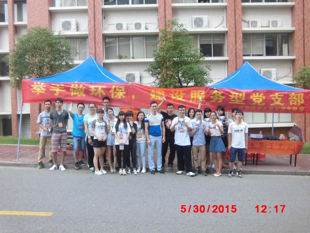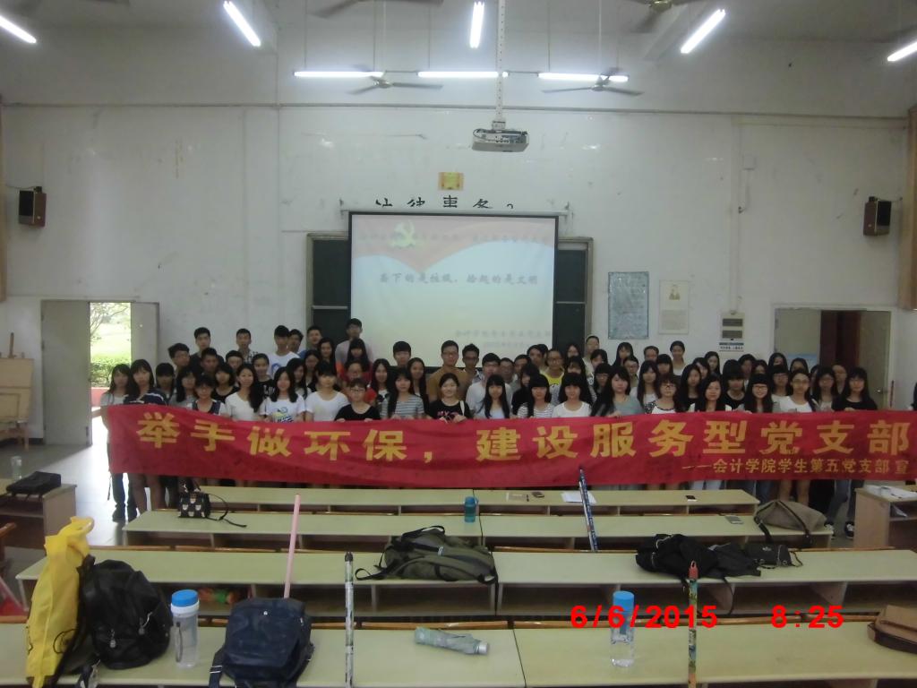 为提升学生环保意识,营造绿色校园文化氛围,把更多的学生纳入宣传绿色理念、实践环保行为的队伍中来,以扩大环保影响力,维持校园的干净清洁,促进党支部工作的开展,我支部于2015年6月6日(周六)至6月14日(周日)连续两个星期在励志楼一楼开展了以“举手做环保,建设服务型党支部”为主题的环保活动。参与人员有会计学院学生第五党支部陈洋广书记、会计学院学生第五党支部全体党员及14级入党积极分子。