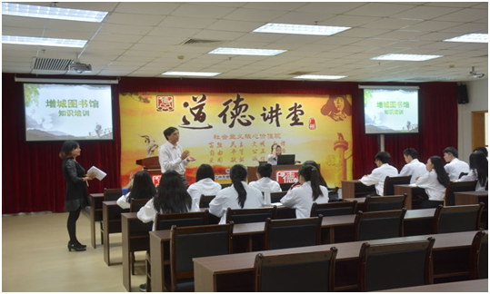下午三点,全体抵达增城图书馆三楼道德讲堂。培训开始前,罗馆长对我们的志愿者工作表示支持,并希望我们在当志愿者的过程中得到另一番感悟。接下来,廖嘉瑜老师从图书馆概况和工作职能这两个方面对我们进行了培训,通过培训,我们对图书馆以及志愿者工作有了进一步的了解。
