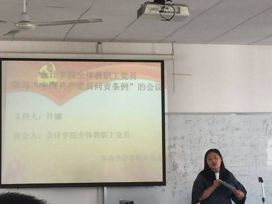 党的十八届六中全会结束后,华商会计学院党总支于2016年11月3日下午在厚德楼A507教室召开了学习《中国共产党问责条例》的讨论会。会计学院全体教职工党员参加了学习讨论会,会议由会计学院副院长、会计学院党总支副书记许娜同志主持。