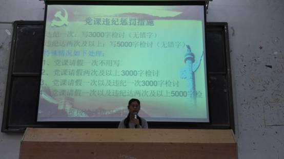 首先,叶心怡同志对各位能顺利成为积极分子表示祝贺,接着,她向大家介绍了会计学院学生第五党支部的支委。为了保证正常的党课教学秩序和入党积极分子能够在将来顺利结业,叶心怡同志讲解了党课考勤制度和影响结业情形。希望在座的入党积极分子能够遵守纪律,认真学习党课内容。