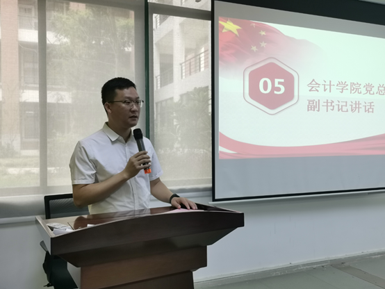 会计学院党总支副书记陈洋广就进一步开展党史学习教育提出具体意见。他认为开展党史学习教育是党的政治生活中的一件大事,要统筹谋划,狠抓落实,打牢每位党员明理、增信、崇德、力行的思想基础。从“统一思想,提高认识,做政治坚定的表率”、“加强领导,精心组织,做带头学习的表率”和“立足岗位,提高本领,做担当实干的表率”三个方面严格要求自己,牢记初心使命,树立担当意识,创新工作模式,在立德树人教育中展现更大担当、更大作为,充分发挥党员先锋模范作用。