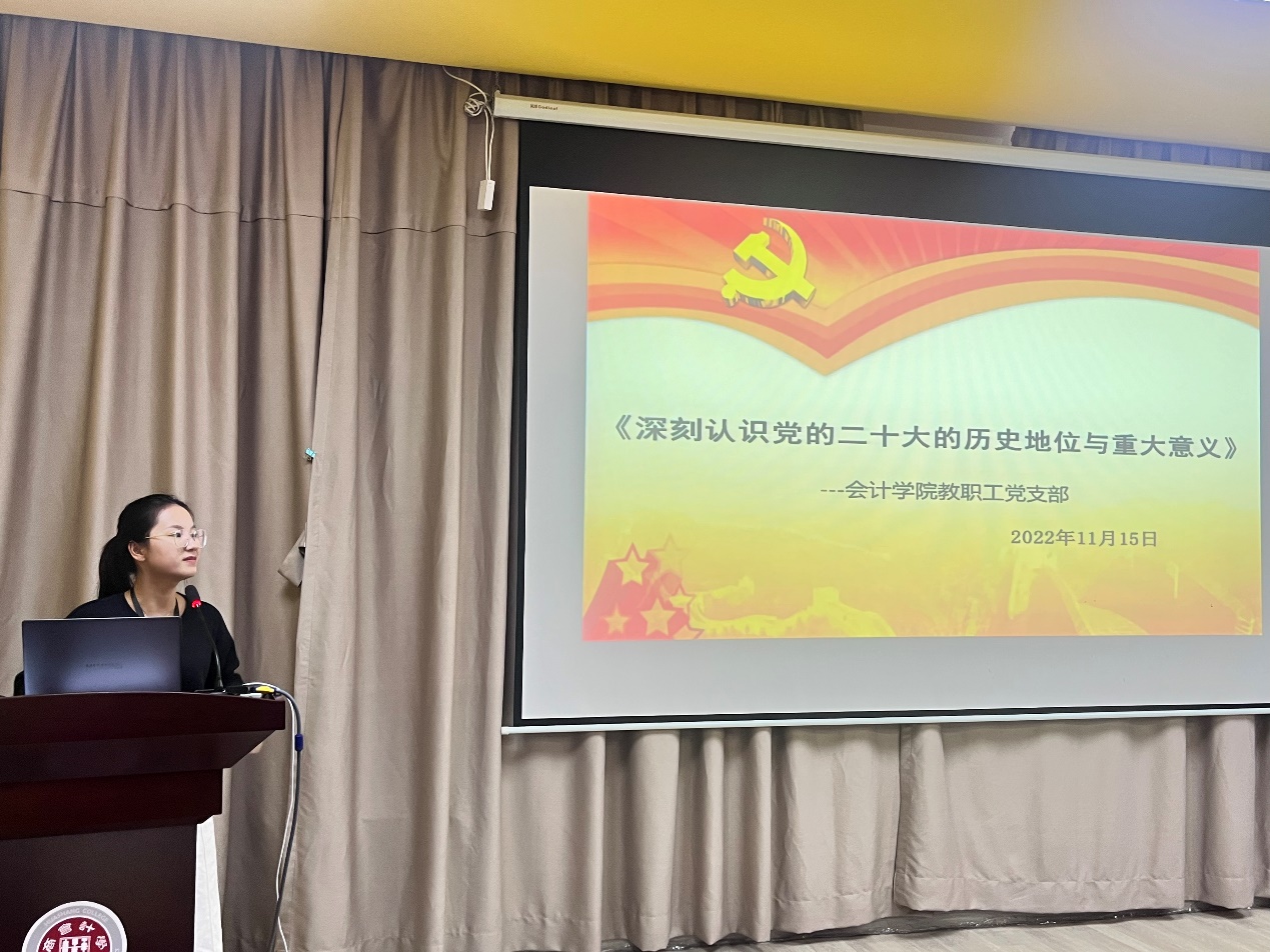 2022年11月15日下午2点,会计学院全体教职工党员于会计学院会议室召开了专题学习会议。会议内容围绕党的二十大展开,进一步学习了党的二十大的历史地位与重大意义。本次会议由刘心馨副书记主持,会计学院教职工党支部全体党员参会。