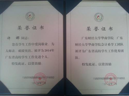 在会议上,广东省广东省教育厅思政处、广东高校学生工作专业委员会对全省2014年度校园文化、主题教育系列活动、学生工作精品项目、红棉奖获奖项目等学生工作先进单位和个人进行表彰。其中,广东财经大学华商会计学院学工团队获得“广东省高校学生工作优秀团队”殊荣,许娜同志获“2014年广东省高校学生工作先进个人”称号。这是华商会计学院加强学生工作队伍建设,提升学生工作水平,完善学生工作制度过程中取得的又一可喜成绩。