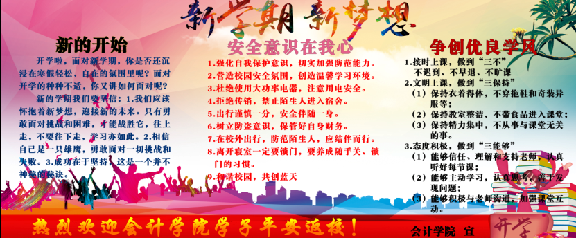 学海泛舟,求是以为帆;雄关漫道,进取以为先。踏着2016的节拍,进步发展的壮丽画卷正在徐徐展开,新梦想在脑海中蓬勃生发,希望会计学院学子们都能拥有新的起点、新的目标,携手同心,业有所成!