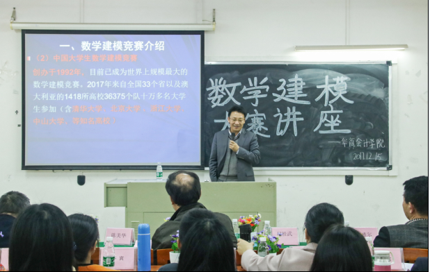 本次竞赛有15组共45名同学在比赛中脱颖而出顺利进入了决赛,为了让参赛者对数学建模竞赛有一个更深入的了解,更好地备战接下来的决赛,我院于2017年12月15日下午4点在厚德楼C313举行了以“大学开展数学建模竞赛的一些思考”为主题的讲座,由来自广东财经大学数学与统计学院院长胡桂武教授开讲。莅临本次讲座的嘉宾有广东财经大学华商学院副院长兼会计学院院长陈美华教授、广东财经大学华商会计学院巴雅尔副院长、建模大赛指导老师郭战伟、李冠恩老师以及会计学院部分老师。本次讲座由郭战伟老师主持。