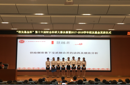 来自广东财经大学、广东金融学院、广东财经大学华商学院和中山大学南方学院四校共9支队伍参加决赛,决赛分为两个环节,论文展示和答辩环节。我院参赛队伍“慧越者”以“供给侧背景下宝武钢合并的动因及绩效分析”为题对他们的研究课题进行了精彩展示。面对评委老师的犀利提问,华商选手们旁征博引,机智应答,获得好评。经过两个多小时的激烈角逐,我院“慧越者”参赛队在大赛中表现突出,最终获得广东财经大学第十六届“财会杯”二等奖的好成绩。