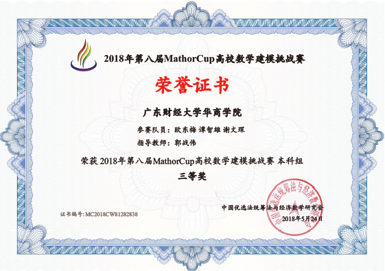 2018年第八届Mathorcup高校数学建模挑战赛结果日前揭晓,我校首次参加本次竞赛,由欧东梅、谭智雄、谢文琛同学组成的学校代表队获得了三等奖。