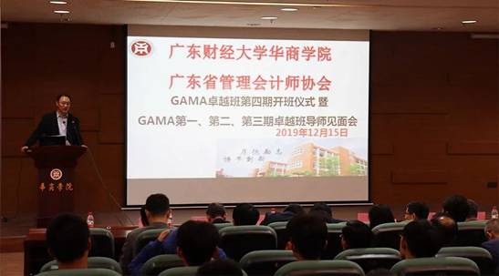 2019年12月15日上午9:30,GAMA卓越班第四期开班仪式暨GAMA第一、第二、第三期卓越班导师见面会在图书馆报告厅隆重召开。广东省管理会计师协会名誉会长、广东外语外贸大学南国商学院执行校长王华教授,广东省管理会计师协会会长、中山大学管理学院林斌教授,广东省管理会计师协会监事长、暨南大学管理学院胡玉明教授,广东省管理会计师协会常务副会长、广东外语外贸大学会计学院刘中华教授,广东财经大学华商学院副校长、会计学院院长陈美华教授,暨南大学管理学院石水平副教授,广东山之风环保科技有限公司副总经理刘大川先生等多位广东省管理会计师协会领导、学业导师和实践导师出席本次会议。华商会计学院师生代表及全体GAMA卓越班学生参加了本次开班仪式。本次会议由会计学院副院长许娜主持。