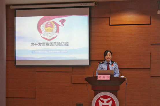 紧接着,国家税务总局广州市税务局第三稽查局审理科税务干部樊莉莎同志向大家介绍了虚开发票税务风险防控的相关内容。樊莉莎强调,随着发票信息化进程的持续推进,对发票违法犯罪行为的打击将会更快、更准、更高效。同学们不论在未来是创业还是就业,都离不开和发票打交道。所以大学生对于如何识别虚开发票的行为以及虚开发票的风险和后果要做进一步的了解,并进行相应的税务风险防范措施,如提高风险防控意识、提升业务流程规范性、强化内部监督管理等,通过多种方式进一步提高自身执业操守,从源头预防发票风险,诚信经营,依法纳税。