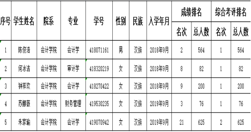 根据《广东省财政厅广东省教育厅关于印发<广东省普通高校本专科生国家奖助学金管理办法>的通知》(粤财教〔2014〕191号)、《广东省教育厅关于做好2021年秋季学期学生资助工作的通知》(粤教助函[2021]7号)以及《关于做好2021年广州华商学院国家奖助学金工作的通知》(华商院学[2021]30号)的相关要求,会计学院坚持公开、公平、公正的原则,严格按照评选程序,经个人申请,学院审核,综合推荐,拟推选以下5名同学为2020-2021学年度国家奖学金候选人。公示名单如下: