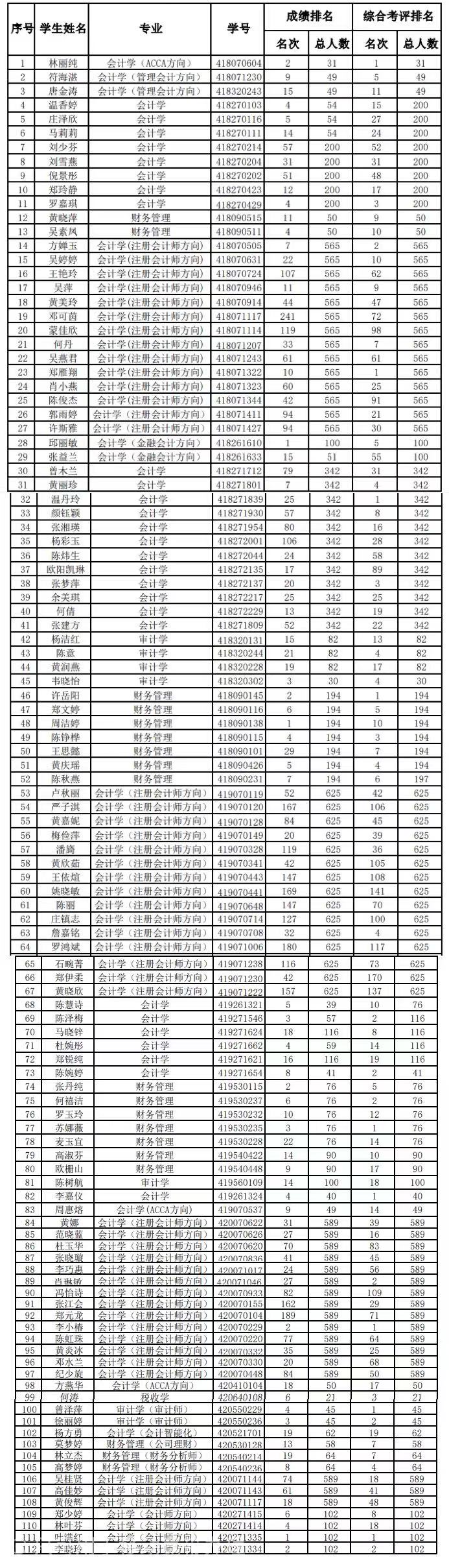 根据《广东省财政厅广东省教育厅关于印发<广东省普通高校本专科生国家奖助学金管理办法>的通知》(粤财教〔2014〕191号)、《广东省教育厅关于做好2021年秋季学期学生资助工作的通知》(粤教助函[2021]7号)以及《关于做好2021年广州华商学院国家奖助学金工作的通知》(华商院学[2021]30号)的相关要求,会计学院坚持公开、公平、公正的原则,严格按照评选程序,经个人申请,学院评议小组审核,拟推选以下112名同学为2020-2021学年度国家励志奖学金候选人。现公示名单如下: