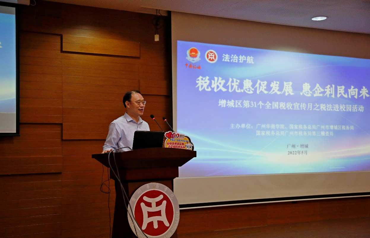 活动伊始,广州华商学院副校长、会计学院院长陈美华教授向税务局干部莅临我校进行税收宣讲表示热烈的欢迎。他表示我校作为增城区税务局税收宣传教育基地和教学与社会实践基地,以培养具有社会责任感、创新精神和实践能力的高素质应用型人才为目标,本次税法进校园活动是进一步深化税校共建的重要载体,对于提高税法知识普及率,营造良好学法遵法氛围,助力我校培养高素质应用型税务人才具有积极的作用。他希望各位师生借此机会认真学习税法知识,提升税务实践能力,切实增强纳税意识,做一名诚实的纳税人,作出新时代青年的贡献。