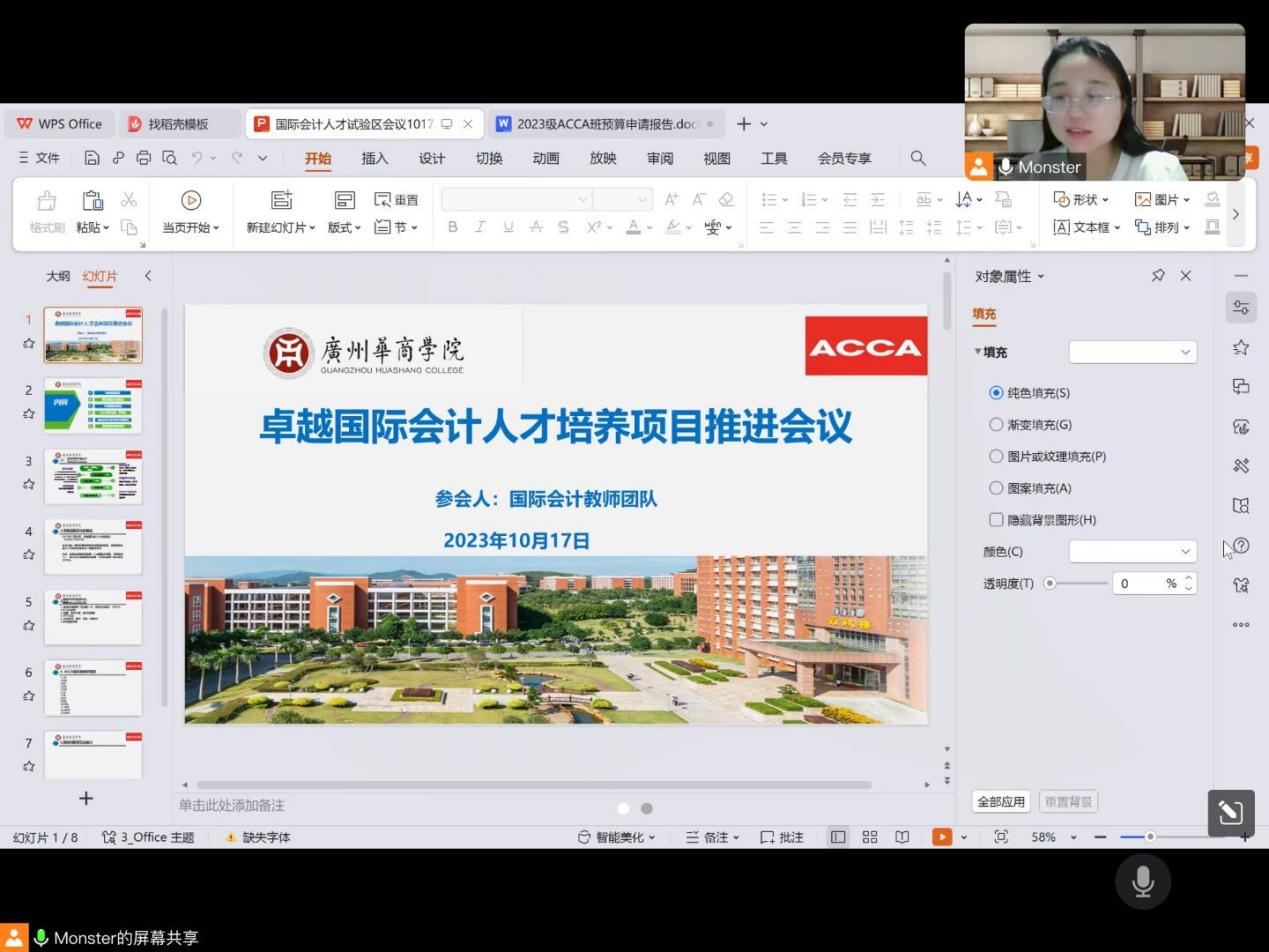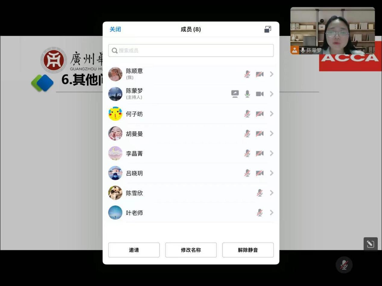为了高效推进卓越国际会计人才培养项目开展,2023年10月18日,广州华商学院卓越国际会计人才培养项目讨论会在腾讯会议线上举行。会议由陈蒙梦副教授主持,参会人有陈顺意、何子昉、胡曼曼、李晶菁、吕晓玥、陈雪欣、叶国安等八位老师。会议主要围绕着项目进展、ACCA各科目建设情况和未来结项预期等进行研讨,并且就后续卓越国际会计人才培养项目的后续推进达成共识。