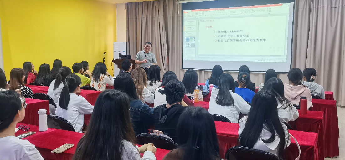 2023年11月28日下午2:30,教育部会计学专业教学指导委员会委员、广州华商学院特聘教授、广东外语外贸大学会计学院原院长刘中华教授应邀在会计学院报告厅给华商会计学院学生作了题为《数字化转型背景下财会专业的知识体系》的学术讲座。会计学院主持工作的副院长刘善球、副院长周书域出席本次活动。讲座由会计学院学工办副主任杨烨瀚主持。