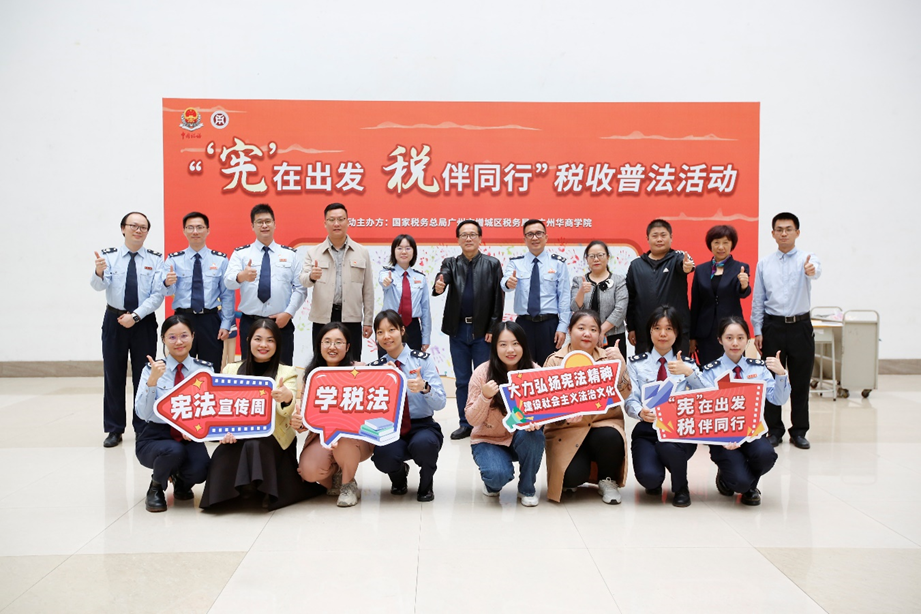 治国凭圭臬,安邦靠准绳。2023年12月4日,是第十个国家宪法日,12月1日至7日为“宪法宣传周”。为大力弘扬宪法精神,建设社会主义法治文化,我校会计学院联合国家税务总局广州市增城区税务局共同举办“‘宪’在出发税伴同行”跨校区税收普法活动。活动于广州校区图书馆报告厅线上线下同步举行,国家税务总局广州市增城区税务局党委委员、副局长黄莹莹、二级高级主办钟健民、增城区税务局“远方田野”乐队、税务青年代表、会计学院主持工作副院长刘善球、会计学院党委副书记、副院长陈洋广,会计学院副院长周书域、会计学院税务系主任张翠凤、税务系副主任李志凤以及会计学院广州、肇庆校区师生代表参加了本次活动。