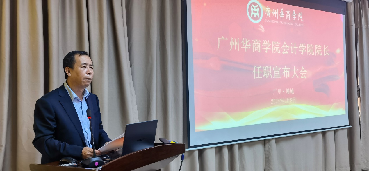 执行校长郭银华发表讲话,他指出,会计学院曾经是学校最早创建的院系,也曾经是学校最大的院系,在历届领导及全体老师的共同努力下,会计学院在学科建设、专业建设、师资队伍建设、课程建设等方面取得了斐然成绩。但当前,学院也面临重要转型时期,希望姚凤民院长带领全院教师,切实抓好会计学国家级一流本科专业建设、会计学广东省一流本科专业建设、财务管理广东省一流本科专业建设、审计学广东省一流本科专业建设、会计学省级重点学科建设、会计学硕士点建设、本科教学合格评估、产教融合等中心工作,打造更多的办学亮点与办学特色。