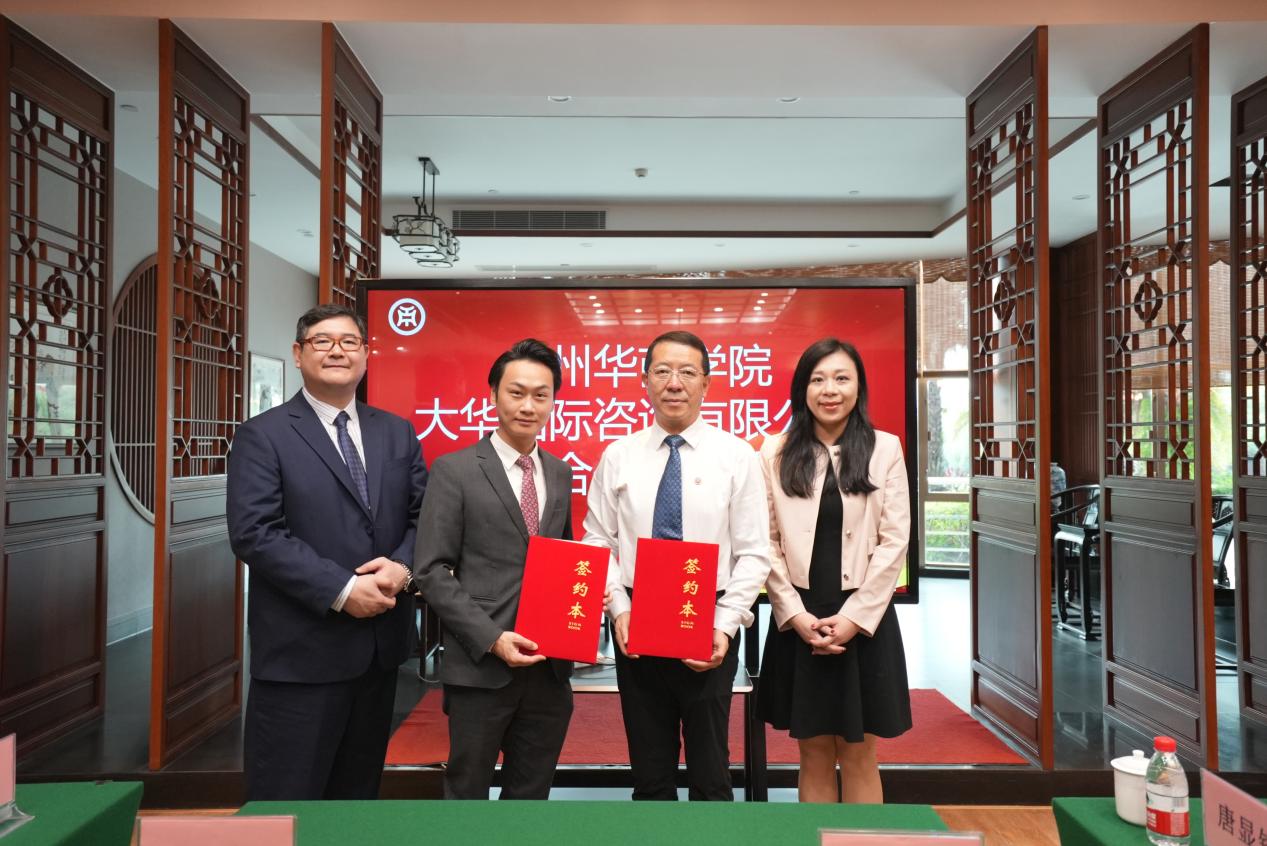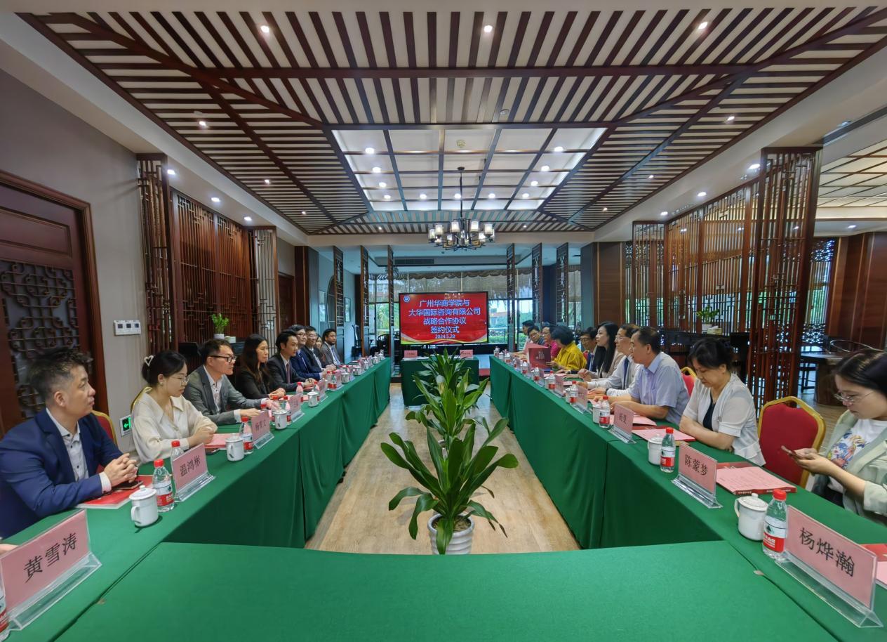 随后,双方举行了签约仪式。会上,吕峻闽副校长代表学校领导班子对大华国际董事会精英和高级管理团队表示热烈欢迎和感谢。他详细介绍了广州华商学院学科特色和教育数智化发展情况。希望校企双方在数智化人才培养、产教融合创新、现代产业学院建设、国际商务服务等领域进行广泛合作,期待合作推陈出新,惠及万千学子,服务好粤港澳大湾区建设和发展。