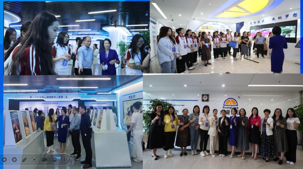 下午,师生们来到广量集团。广量控股集团董事长何翠群率团队热情接待,总裁办主任黄娟带领师生参观了中科智汇数字人展厅及集团文化长廊。广量商学院执行院长王佩深入浅出地讲解了AI数字人应用案例、人机交互智能体验,展示了广量集团在数字化创新方面的前沿成果。同时,师生们也深入了解了企业的发展历程以及亲农广场助农平台的深远意义,深刻感受到广量集团在数字化转型过程中,不仅注重技术创新,还积极履行社会责任,推动产业融合发展。