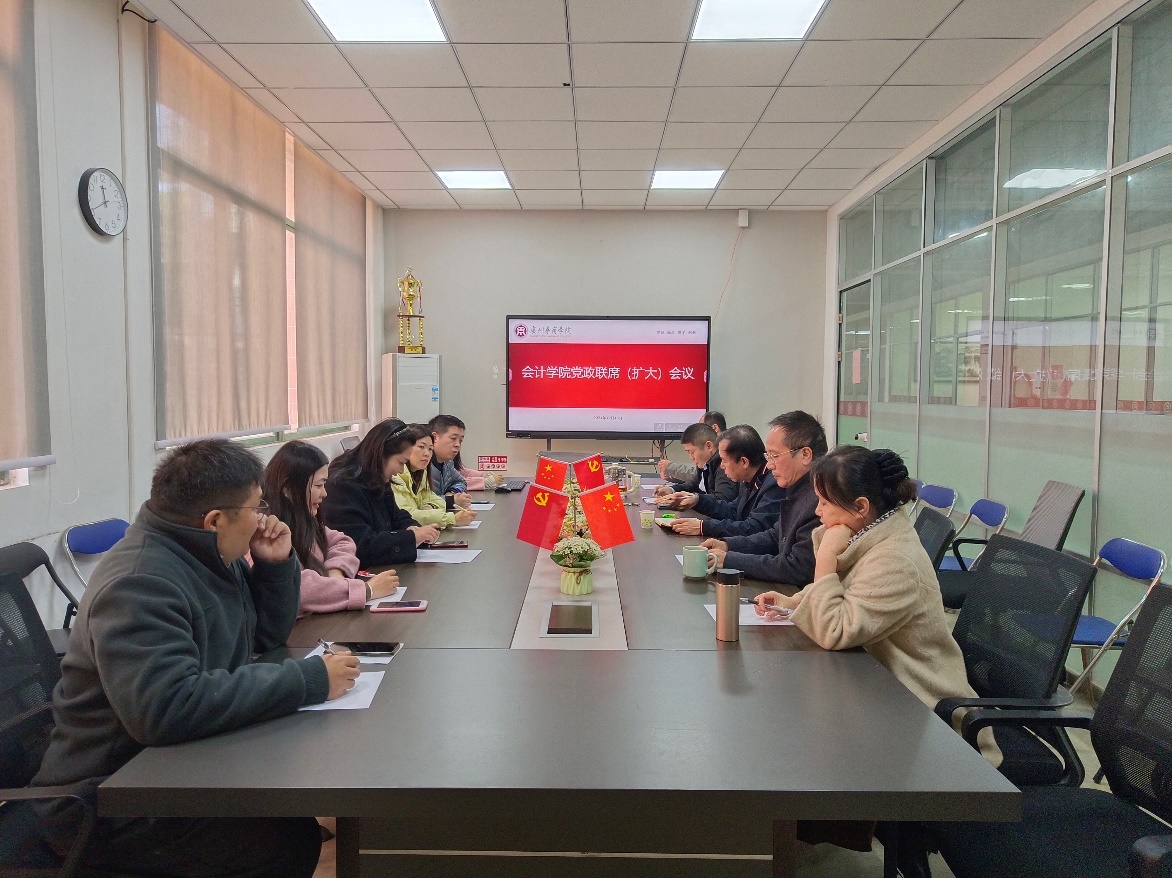 12月16日,会计学院党政联席(扩大)会议在学院会议室召开。学院领导班子全体成员、全体党委委员、各系部负责人、数智会计与商务服务产业学院负责人齐聚一堂,共商学院发展大计。此次会议围绕学习贯彻党的二十届三中全会精神、本科教学合格评估阶段性总结、学期末工作部署、教职工集体活动安排及学院人事工作安排等议题,会议由会计学院院长姚凤民主持。