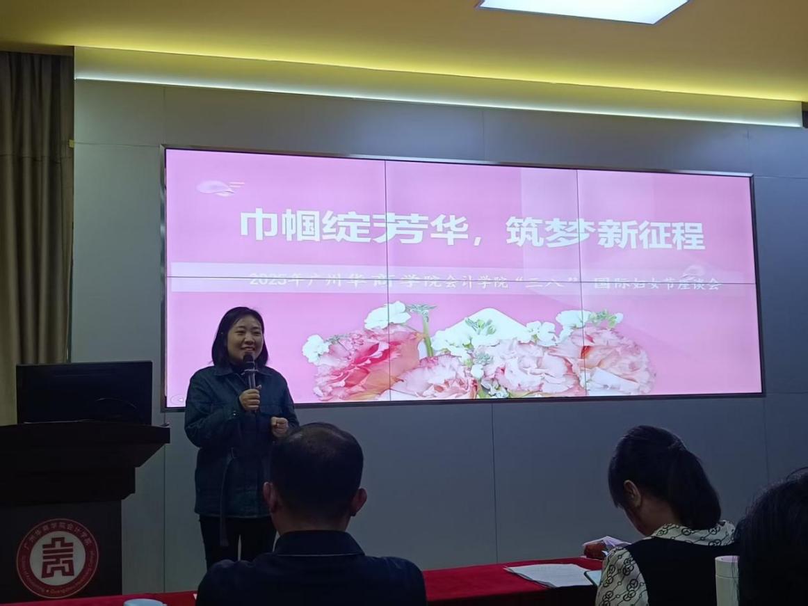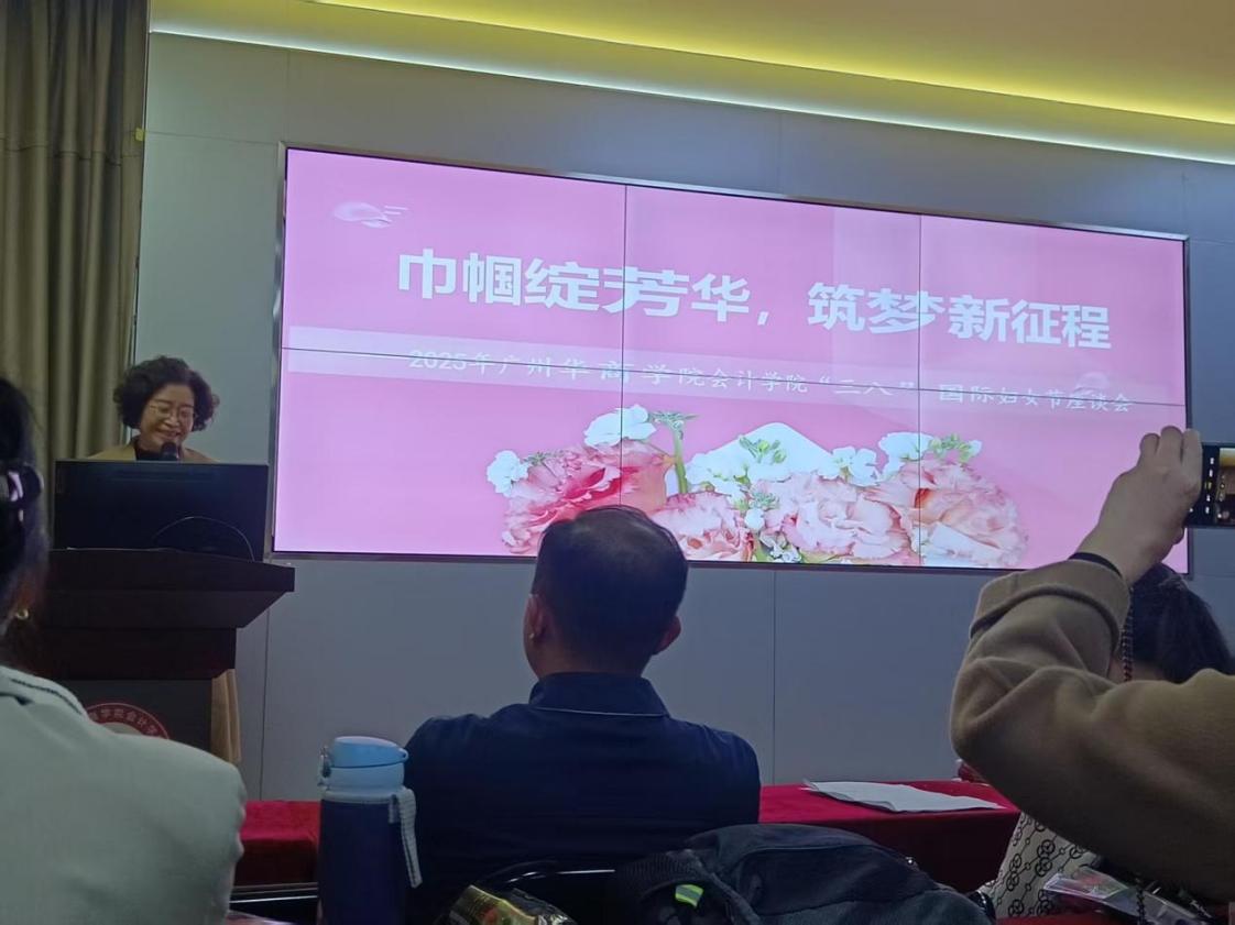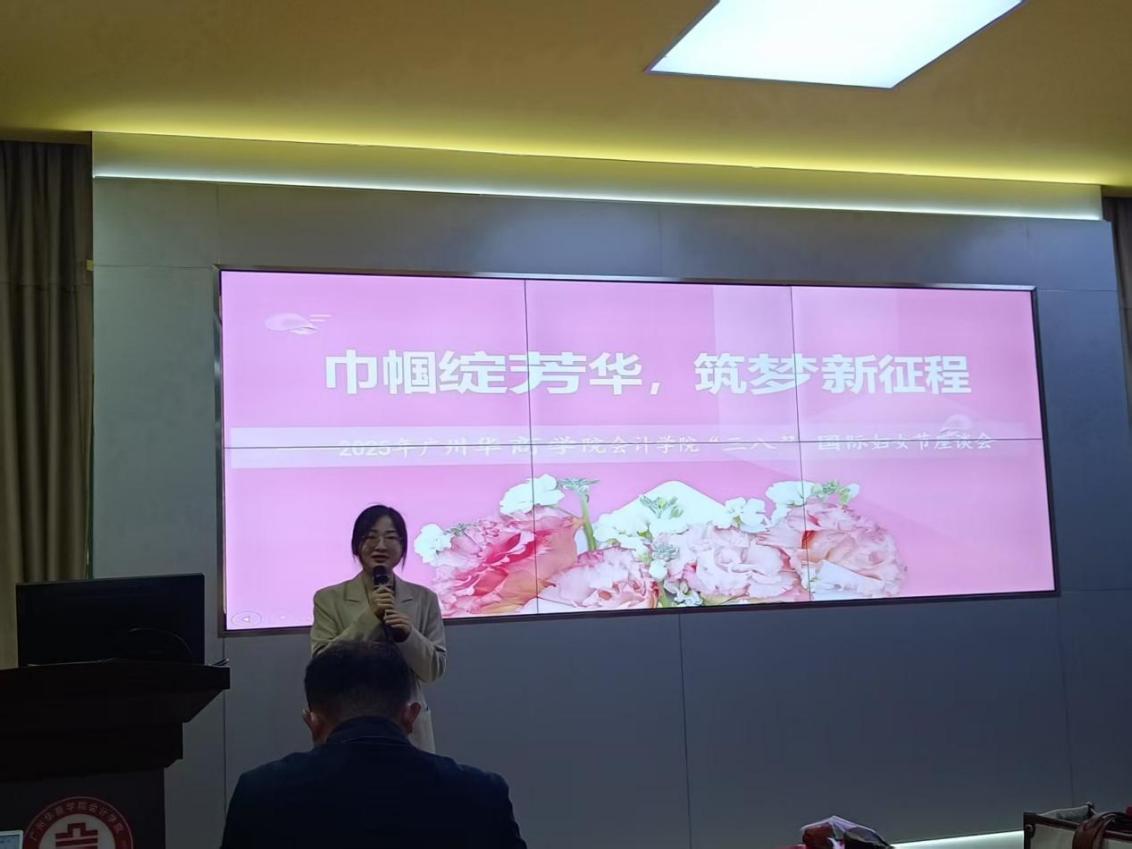 为庆祝第115个“三八”国际妇女节,弘扬新时代知识女性风采,凝聚奋进力量,3月18日,广州华商学院会计学院举行主题为“巾帼绽芳华,筑梦新征程”的座谈会,学院院长姚凤民、党委副书记、副院长陈少鸿、副院长周书域及学院女教职工参加会议。座谈会由学院副院长、工会主席周书域主持。