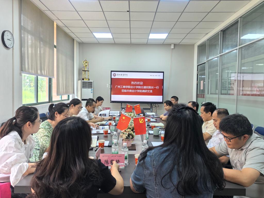 2025年6月11日,广州工商学院会计学院副院长彭良军,会计学专业负责人黄璐,审计学专业负责人刘飞,财务管理专业负责人宋娜,审计学专业教研室主任徐晨歌,会计学院科研秘书彭馨莹一行6人来访学院调研交流。广州华商学院会计学院院长姚凤民,党委书记刘善球,副院长杨旻、陈少鸿、周书域,院长助理陈蒙梦、陈平,数智会计与商务服务产业学院副院长范卫星及各专业负责人、教学系主任在学院会议室参加接待并出席交流会,交流会由姚凤民院长主持。