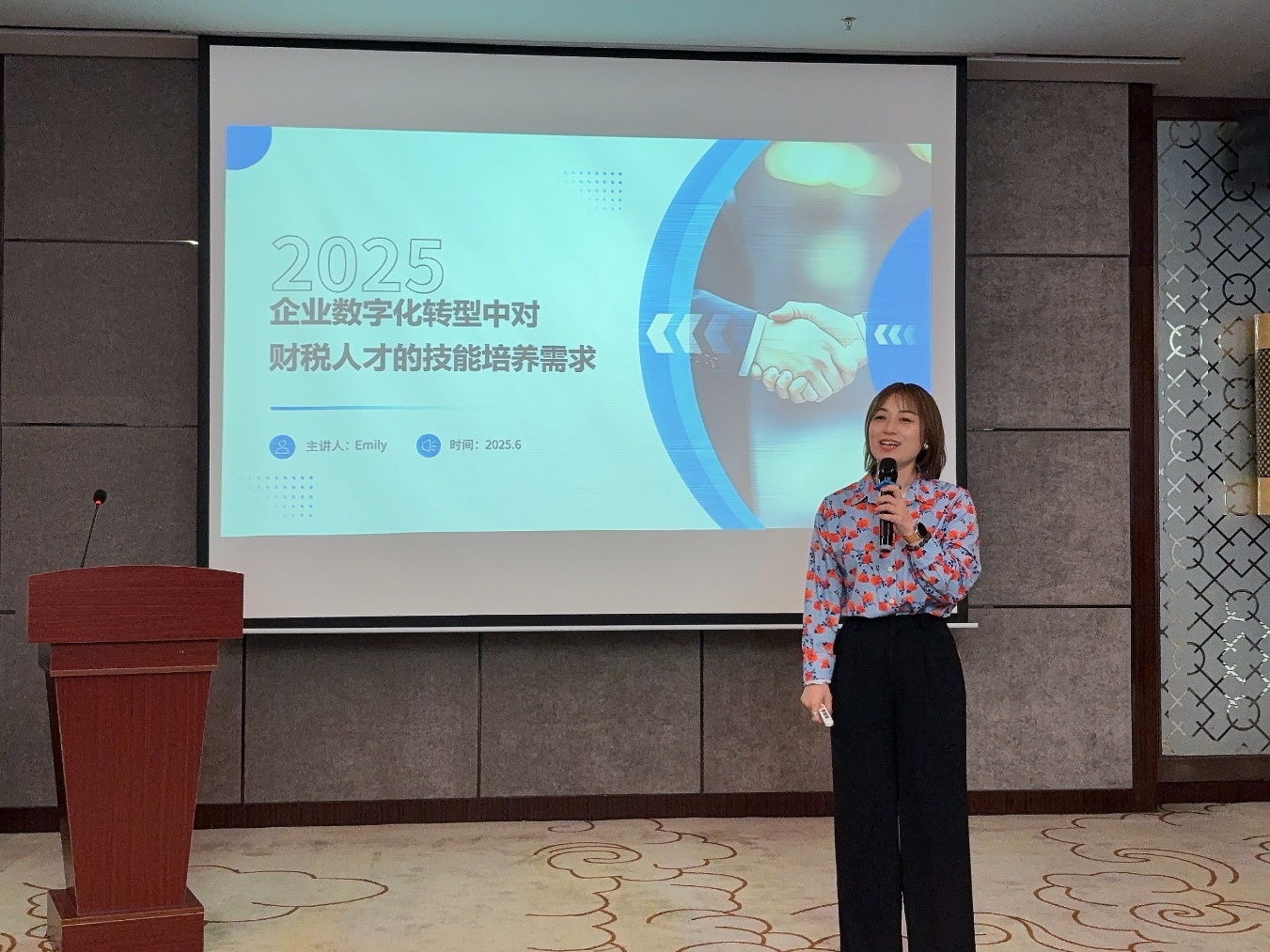 英纳法天窗系统集团有限公司中国区人力资源部张瑞雪总监以“企业数字化转型中对财税人才需求及技能要求”为主题进行分享。她通过对比初级会计和财务总监能力矩阵,分析传统财税人才面临技能单一化、业务融合不足等挑战,强调数字化转型下,财税人才需具备数据分析、业务融合和沟通协作等能力。她指出,虚拟仿真课程、企业实地调研、小组合作汇报等方式有利于培养“懂数据、通业务、善表达”的复合型人才,为会计学院培养适应企业需求的财税人才提供方向。