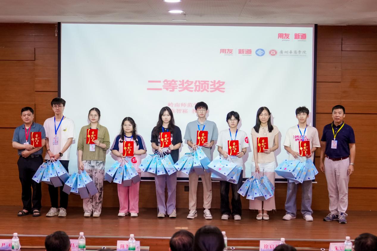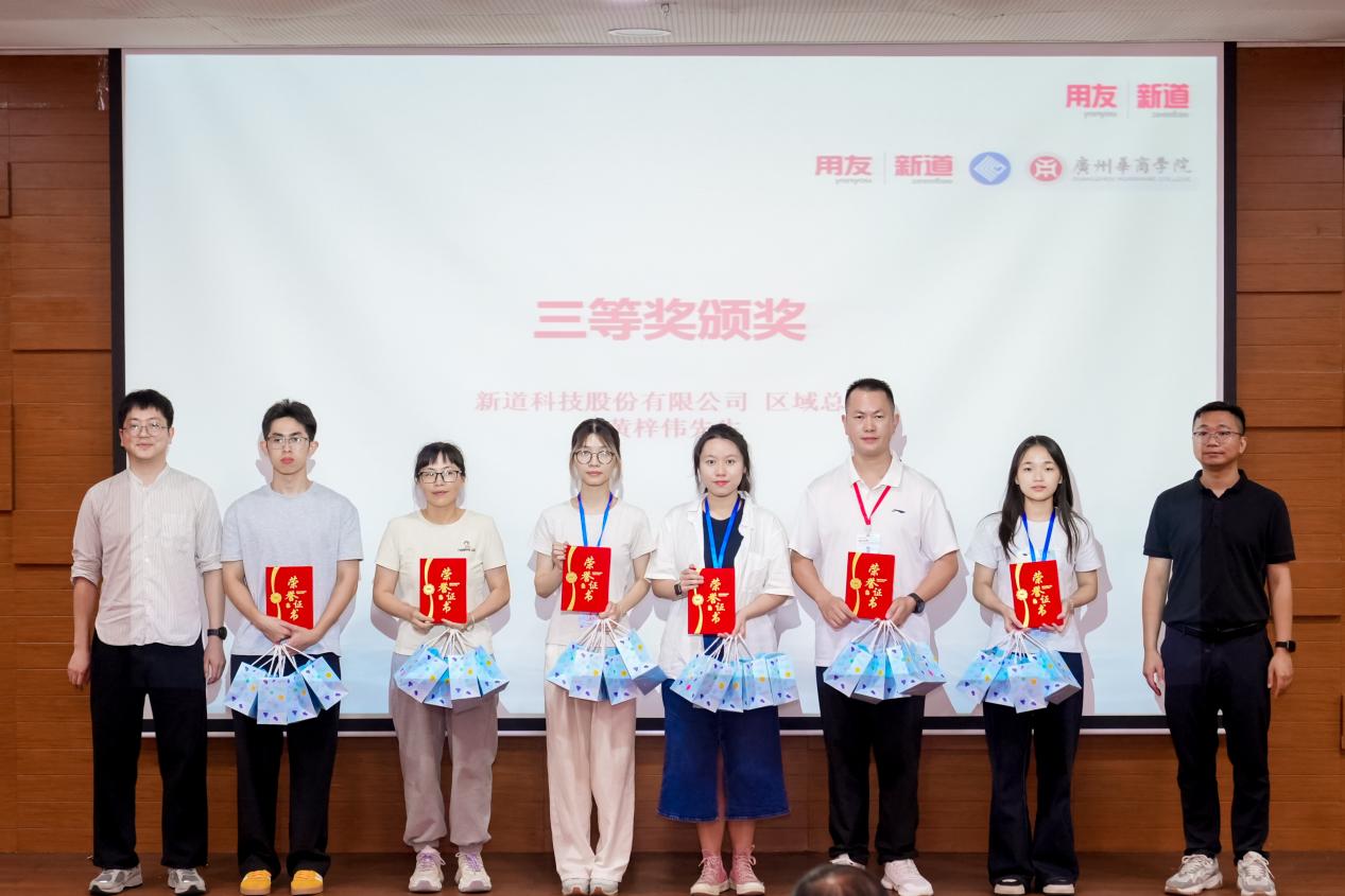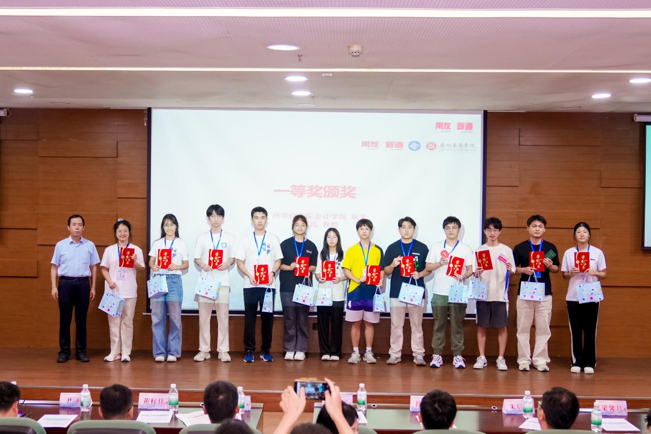 新道科技股份有限公司区域总监黄梓伟、服务总监徐启超、陈智崧裁判长、姚凤民院长分别为三等奖、二等奖、一等奖获奖队伍颁奖。获奖选手手持证书与奖杯,脸上洋溢着喜悦与自豪,现场掌声雷动,将闭幕式推向高潮。