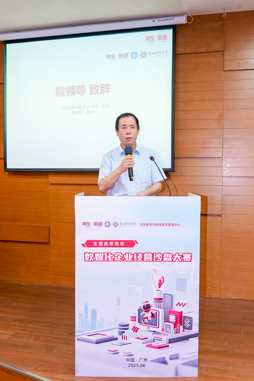 广州华商学院会计学院院长姚凤民教授致辞,肯定了选手们的精彩表现,强调赛事对推动产教融合、数智化人才培养的积极作用。姚院长指出,通过此次比赛,检验了参赛学生在数智化经营方面的理论知识与实践能力,为学生们未来的职业发展奠定了坚实的基础。姚凤民院长鼓励所有参赛选手,无论获奖与否,都要保持对知识的渴望和对实践的热爱,继续在数智化领域探索前行,为成为新时代的财经精英而不懈努力。