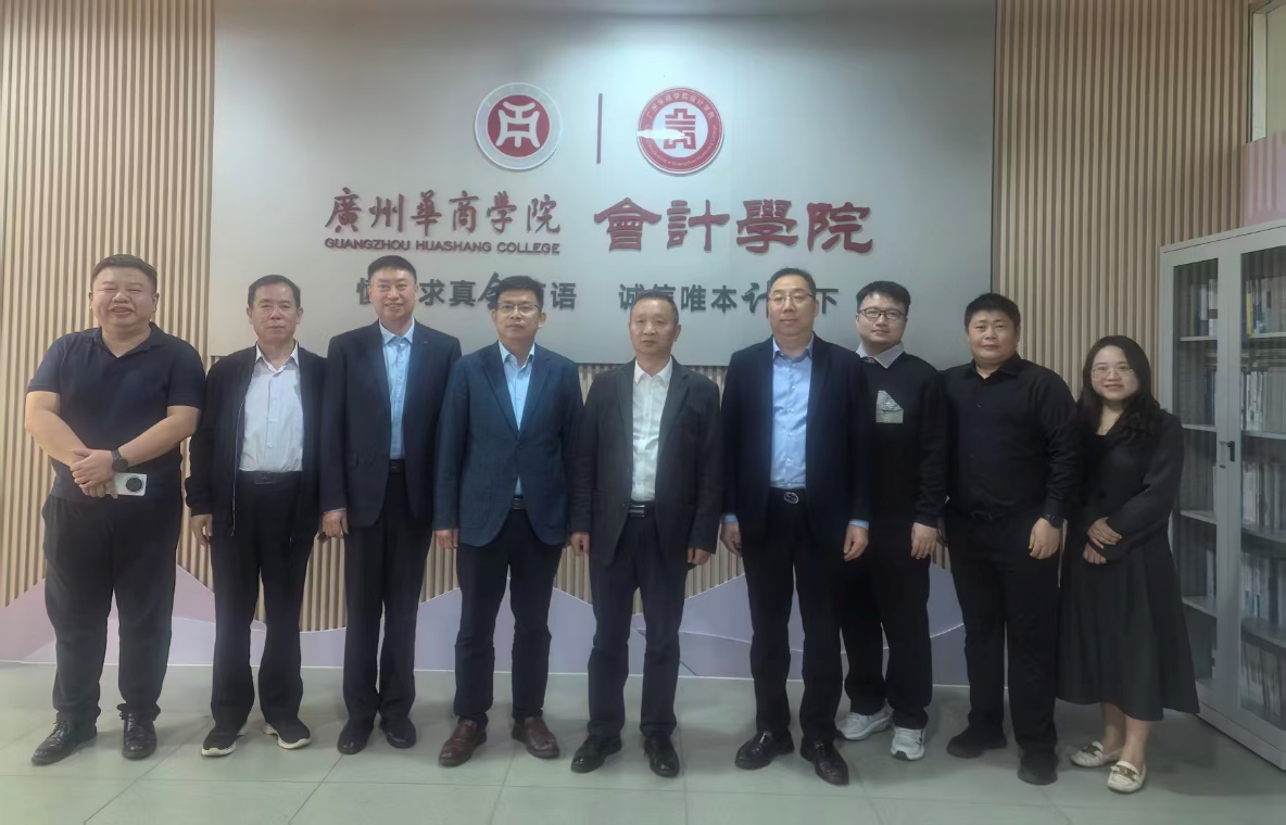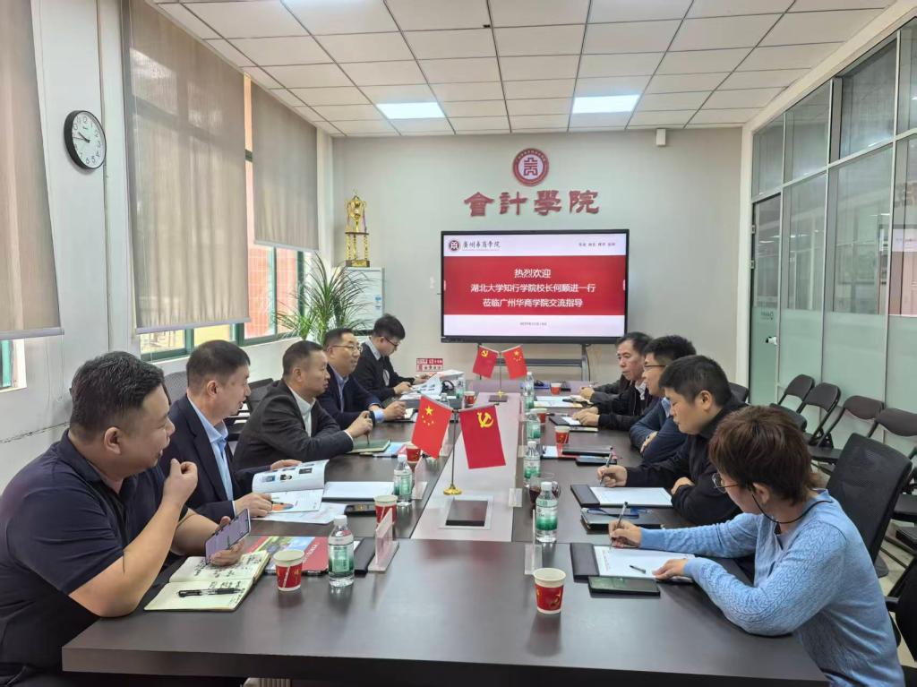 2025年11月14日,湖北大学知行学院校长何顺进,教务处长易有明,会计学院院长刘容一行4人在正誉企业管理(广东)集团股份有限公司董事长鲁银花、副总裁熊浩等陪同下来我校交流,广州华商学院副校长余家军,会计学院院长姚凤民等热情接待了何顺进校长一行。