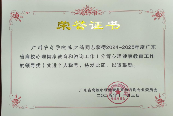 近日,广东省高校心理健康教育与咨询专业委员会公布2024-2025年度评优结果,会计学院党委副书记陈少鸿接连荣获两项省级殊荣,分别获评2024-2025年度广东省高校心理健康教育和咨询工作“先进个人”,其学术论文亦荣获省级优秀论文二等奖,充分彰显学院在心理健康教育工作方面的扎实成效与创新活力。