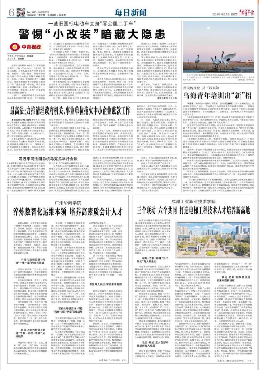 2025年12月5日,《中国青年报》第六版以“淬炼数智化运维本领 培养高素质会计人才”为题,报道了我校会计学院的创新育人实践。