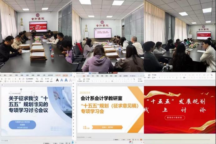 会前,会计学院会计系、财务系、审计系、税务系4 个系分别组织教师开展专题研讨,围绕学校 “十五五” 规划(征求意见稿),结合各系学科特色、教学科研重点、人才培养方向等核心工作,充分交流研讨、凝聚系部共识,梳理形成针对性强、可行性高的修改建议与发展意见,为本次专题会议的高效开展奠定坚实基础。