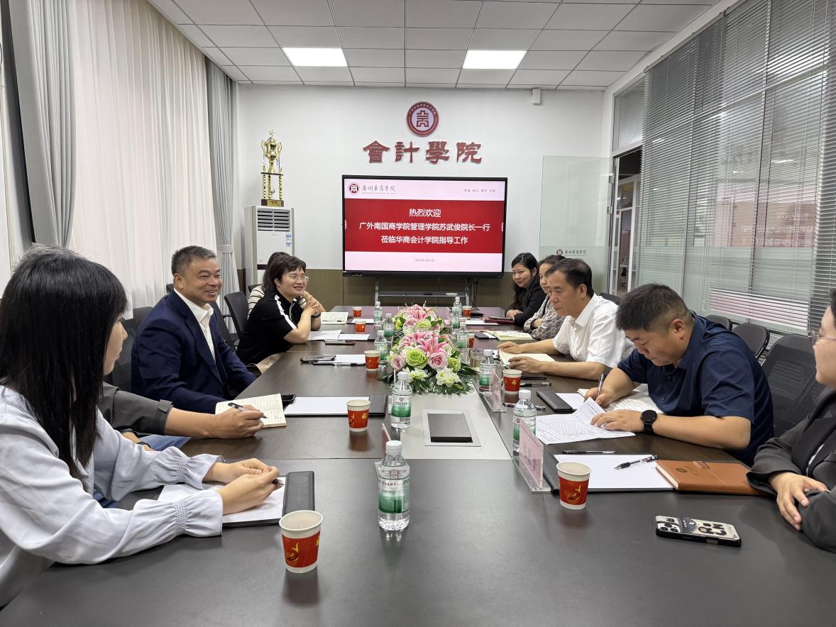 2026年4月3日,广东外语外贸大学南国商学院管理学院院长苏武俊、副院长文佑云率领骨干教师一行5人,莅临广州华商学院会计学院开展专项交流活动。广州华商学院会计学院院长姚凤民在会计学院会议室热情接待了苏武俊院长一行,学院副院长杨旻、周书域,院长助理陈平、陈蒙梦陪同接待并参与座谈。