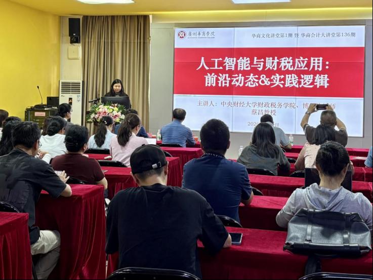 为紧跟数字时代财税行业变革趋势,深化人工智能技术与财税专业教育的融合创新,2026年4月9日,会计学院特邀中央财经大学蔡昌教授做客华商文化讲堂第1期暨华商会计大讲堂第136期,带来题为《人工智能与财税应用》的精彩学术讲座。讲座由会计学院院长助理陈平副教授主持,广州校区学院师生代表齐聚会计学院报告厅,肇庆校区通过线上分会场观看,共探AI赋能财税发展的新趋势、新路径与新策略。