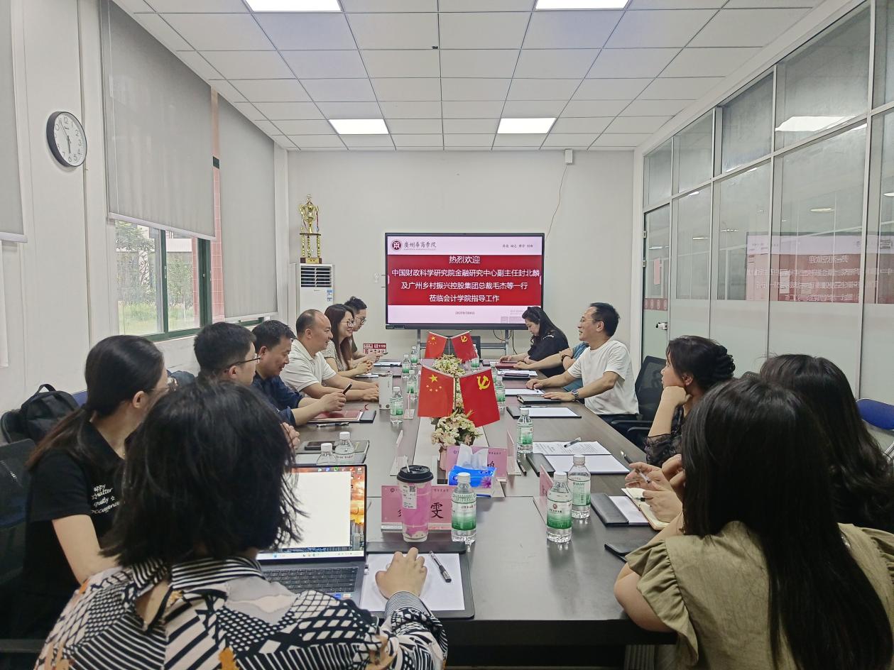 2025年5月8日下午,中国财政科学研究院金融研究中心副主任封北麟、副研究员黄亦炫、助理研究员黄宝竹及广州乡村振兴控股集团总裁毛杰、副总裁何青倩等莅临会计学院指导工作,会计学院党委书记刘善球、副院长杨旻、副院长周书域,以及院长助理陈蒙梦老师、陈平老师等共同参会。双方围绕“乡村振兴战略落地”与“应用型人才培养”两大主题展开思维碰撞。